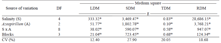 By observing the isolated factors salinity and Azospirillum, in addition to the salinity x Azospirillum interaction, concerning the leaf, stem, tassel and root dry masses, it was found a significant effect (p < 5 %) of the increasing levels of salts on leaf dry mass and stem dry mass, in addition to the interaction effect for root dry mass (Table 2).