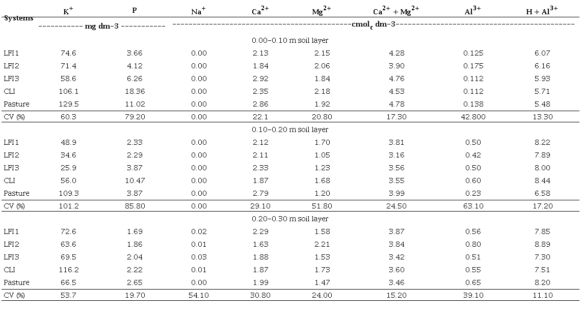 The K+ contents varied from 58.6 to 129.5 mg dm-3 in the 0.00-0.10 m layer, from 25.9 to 109.3 mg dm-3 in the 0.10-0.20 m layer, and from 63.6 to 116.2 mg dm-3 in the 0.20-0.30 m layer (Table 1). Similar results were found by Ferreira et al. (2009), in soils under crop-livestock-forest integration, in the Rio Grande do Sul state, Brazil. They reported that the high K+ contents in pasture areas are due to the digestion process of animals, since 90 % of the K+ in these environments are from feces and urine and are in ionic form, readily available to plants.