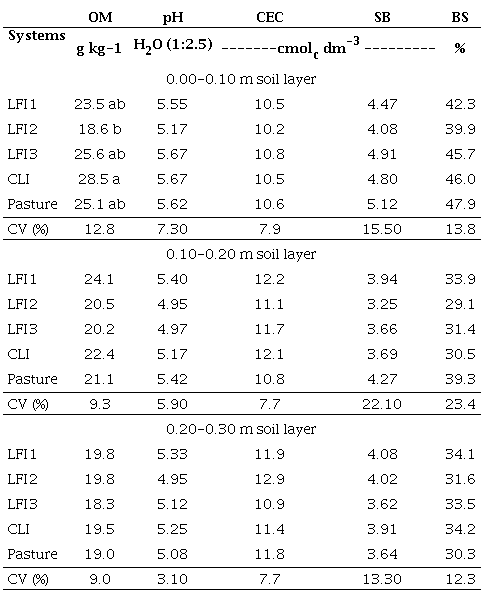 The means for soil organic matter contents, pH, cation exchange capacity, sum of bases and base saturation (Table 2) showed that only the soil organic matter contents in the 0.00-0.10 m layer were significantly different among the treatments (p < 0.05), with the highest contents in the B. decumbens + maize system (28.5 g kg-1) and the lowest ones in the B. decumbens + G. sepium system (18.6 g kg-1).