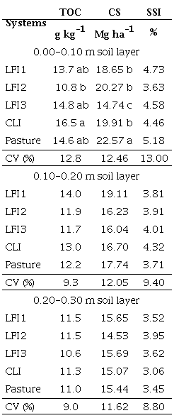 The total organic carbon differed between the evaluated systems only in the 0.00-0.10 m soil layer (Table 3). The soil carbon stock and structural stability index were similar among the treatments (p < 0.05).