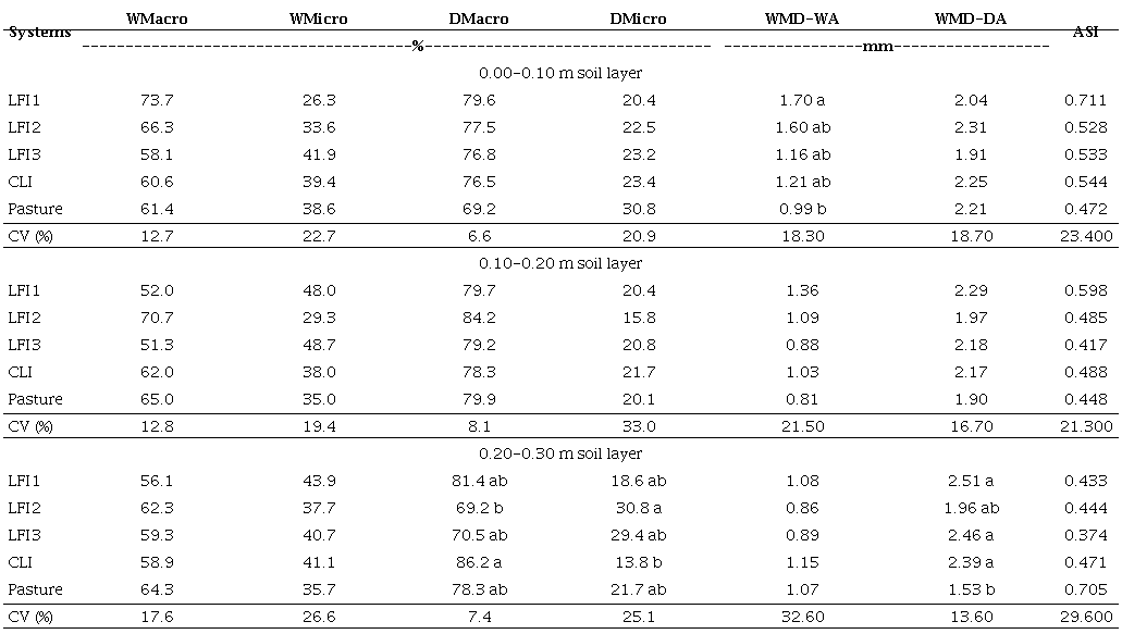 The weighted mean diameter of wet aggregates showed a significant difference in the 0.00-0.10 m layer, and the highest mean was found for the B. decumbens + T. impetiginous system, with 1.70 mm (Table 4).