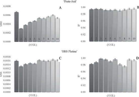 The prediction capacity of the model can be linked to the maximum and exhaustive number of trainings in the network, in favor of the most robust, adequate and accurate architecture (Soares et al. 2014). For this purpose, ten ANN models were evaluated, with one to ten neurons in the intermediate layer, to predict the yield for the two banana cultivars (Figure 1). The performance of the network architectures was measured by the mean quadratic error (Figures 1A and 1C) and by the coefficient of determination (R2) (Figures 1B and 1D). The combinations with two and three neurons in the intermediate layer provided the best network structures for the ‘Prata-Anã’ (Figures 1A and 1B) and ‘BRS Platina’ (Figures 1C and 1D) cultivars, respectively.
