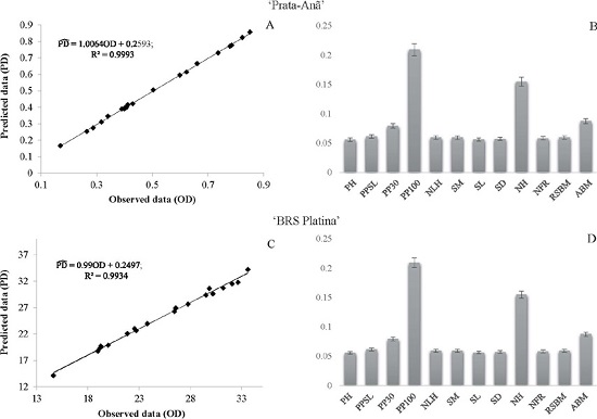 In order to obtain an estimate for the ‘Prata-Anã’ bananas yield with higher predictive capacity, higher accuracy and in line with the practicality of obtaining them in the field, were tested, with data from the validation sample, the morphological components associated with the characteristics with higher relative information, higher correlations and based only on the easily measured characteristics for ‘Prata-Anã’ and ‘BRS Platina’.