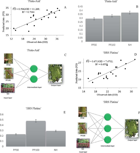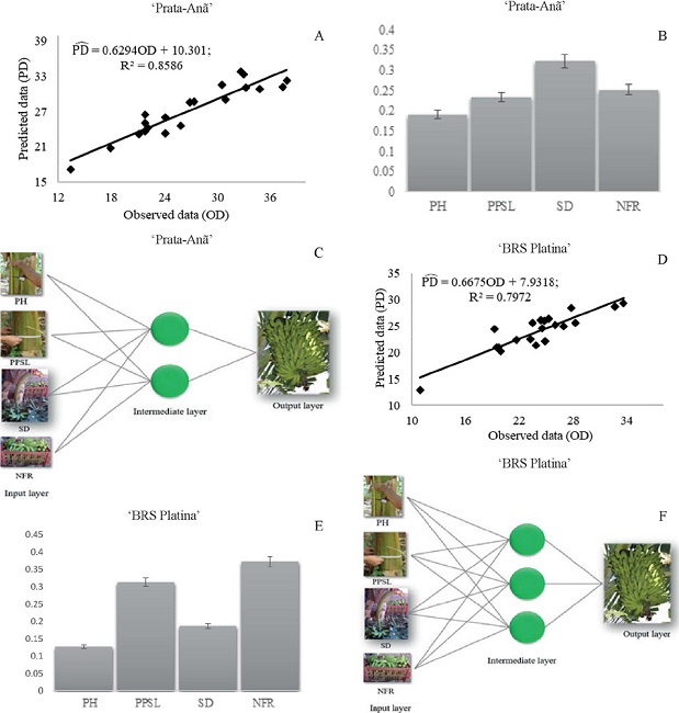 Neural networks with R2 of 0.70 and 0.65 were adjusted for ‘Prata-Anã’ (Figures 3A, 3B and 3C) and ‘BRS Platina’ (Figures 3D, 3E and 3F), respectively. In these models, were considered characteristics that are easy to measure in the field, and that can be measured at the time the inflorescence is emerging, about 120-150 days before the harvest for cultivars of the ‘Prata’ type (Donato et al. 2016), what facilitates scheduling the harvest and forecasting delivery by the producer (Guimarães et al. 2013), such as the perimeter of the pseudostem at 30 and 100 cm and the number of hands for both cultivars.