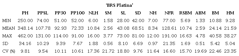 Still based on the yield descriptors, intermediate variation coefficient values were found for the stalk and bunch mass ratio and for the average mass of hands, with variation coefficient values of 16.31 and 18.02 % for ‘Prata-Anã’ and 15.70 and 19.69 % for ‘BRS Platina’, respectively (Table 1). The vegetative variables perimeter of the pseudostem at the soil level, at 30 and 100 cm from the soil were similar between the cultivars, in terms of variability, with variation coefficient of 11.59-12.63 % for ‘Prata-Anã’ and 9.54-10.61 % for ‘BRS Platina’ (Table 1). On the other hand, the number of live leaves at harvest and the plant height showed, respectively, the highest and the lowest variations among the vegetative characteristics, with 16.21 and 10.35 % for ‘Prata-Anã’ and 9.81 % and 17.36 % for ‘BRS Platina’ (Table 1).