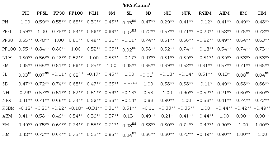 On the other hand, the morpho-agronomic characters perimeter of the pseudostem (soil, 30 and 100 cm) and number of hands and fruits, besides being easily obtained in the field by direct measurement and counting, showed significant correlation coefficients with parameters related to yield, with r values equal to 0.76; 0.70; 0.69; 0.70; and 0.74, respectively, for ‘Prata-Anã’; and 0.75; 0.64; 0.74; 0.60; and 0.74, in that order, for ‘BRS Platina’ (Table 2). Additionally, it is worth considering that the perimeter of the pseudostem can be measured at the time of flowering, as, from the change from the vegetative to the reproductive stage, the perimeter of the pseudostem no longer undergoes variation and/or an increase in its dimension, what allows the prediction of yield up to four months in advance using this feature (Guimarães et al. 2013).