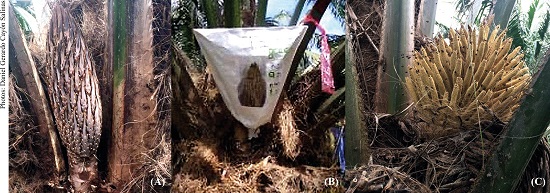 The cultivated area for the O x G hybrid in Colombia is approximately 35,700 ha, representing 6.4 % of the total area cultivated with oil palm in the country (Sispa 2015). O x G hybrids produce few male inflorescences and have low pollen viability, what indicates that a certain genetic imbalance occurs (Alvarado et al. 2000). Peduncular bracts or spathes cover female inflorescences, hindering the pollen entry. These characteristics affect natural pollination and, therefore, bunch production and oil yield per hectare.