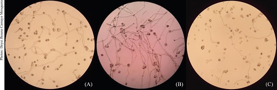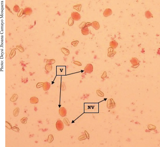 For germination, the medium described by Turner & Gilbanks (1974) was used, consisting of 11 g of sucrose and 1.2 g of agar dissolved in 100 mL of distilled water and boiled for 5 minutes; then, the medium was placed in Petri dishes and allowed to cool to room temperature. The pollen was sprinkled on Petri dishes and incubated for two hours at 35 ºC (Chia et al. 2008). The readings were taken at 40× magnification on an Olympus CX21 microscope, and the pictures were taken with a 10-megapixel digital camera coupled to the microscope. Only those that developed a pollen tube greater than or equal to the diameter of the pollen grain were counted as germinated grains (Kakani et al. 2002), using the ImageJ™ software.