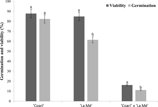 Figure 3 shows that the percentage of pollen viability by acetocarmine staining was higher than for in vitro germination, indicating that not all pollen grains classified as viable germinated in the agar-sucrose medium. In many species, in vitro pollen germination is dependent on the addition of key substrates, such as calcium nitrate, boron and magnesium, to the germination media. Indole-3-acetic acid promotes pollen tube growth in the pistil and stimulates pollen tubes to grow long and straight (Abdelgadir et al. 2012). However, staining tests with nuclear dyes, such as acetocarmine, are very accurate for determining pollen fertility, because they indicate the integrity of the nucleus when dyeing the chromosomes (Sunilkumar et al. 2013). In general, it is expected that staining methods overestimate the pollen viability (Sulusoglu & Cavusoglu 2014). Instead, an in vitro germination test can yield results that better approximate the actual pollen viability, as the sucrose-agar medium emulates the stigma exudate where pollen is deposited (La Porta & Roselli 1991). The low viability observed in the pollen of ‘Coarí’ x ‘La Mé’ was a consequence of its origin, hybridization between genetically close parents, as evidenced in a previous study (Rodríguez-Rojas et al. 2015). While some hybrids can break postzygotic barriers, it is expected that they present a lower fertility, relatively to the parental species (Marques et al. 2011). The grains of pollen of the hybrid present low percentages of viability and germination due to the fact that they vary in size and form, with regard to E. oleifera and E. guineensis, and, during their formation, they undergo frequent divisions of abnormal cells (Sánchez & Romero 2013).