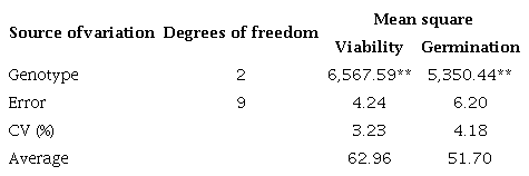 In the present study, a highly significant (p < 0.01) and positive correlation coefficient of 0.9663 was observed for the association between viability and in vitro germination percentage, that is, a low viability implied a low pollen germination percentage and vice-versa, while a high viability generated high germination values for the pollen grains.