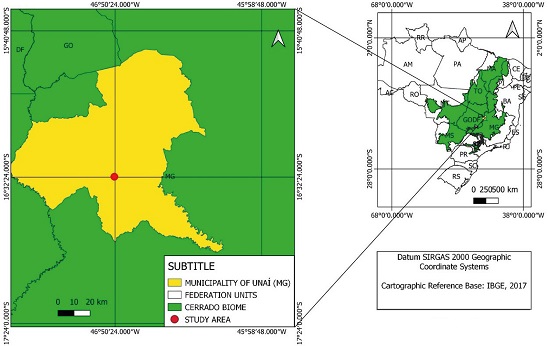 A field experiment was carried out in the Cerrado (Brazilian Savanna) biome, as part of a research project on the impact of conservation agricultural practices on soil fertility and crop yields, in Unaí (16º32’26”S, 46º50’44” W and altitude of 600 m), north-western of the Minas Gerais state, Brazil (Figure 1).