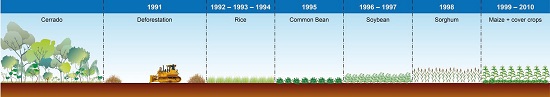 The area was deforested 14 years before the establishment of the experiment, in 1991. The vegetation, classified as “Cerradão”, was cleared by caterpillar tractors pulling a chain, and the vegetation was concentrated in windrows before being burned. The subsequent crops were upland rice for three years, bean for one year, soybean for two years, sorghum for one year, and maize for 11 years (Figure 2).