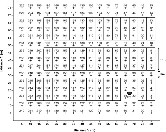 The entire experimental area measured 80 x 75 m. Soil samples were collected in March 2010, on a 5 x 5 m grid, from the 0-0.2 m depth, resulting in a total of 240 samples (Figure 3). A 0-0.2 m sampling was chosen to avoid an effect related to soil stratification close to the surface in the no-tillage system (Crozier et al. 1999). The soil analysis was carried out with air-dried < 2 mm sieved material (Claessen 1997). The soil pH was measured in distilled water pH(H2O) and 0.01 M CaCl2 [pH(CaCl2)], using a 1:2.5 (w:v) soil:solution ratio. Exchangeable calcium (Ca2+) and magnesium (Mg2+) were extracted with 1 M KCl. Available potassium (K+) and phosphorus (P) were extracted with a Mehlich-1 solution (0.0125 M H2SO4 and 0.050 M HCl).