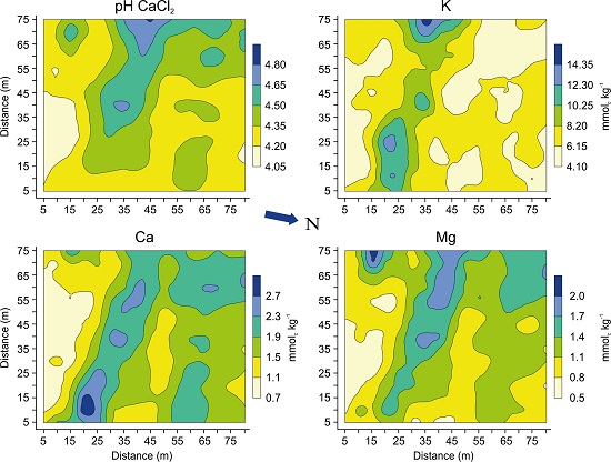 The knowledge of the spatial variability of soil properties at the field scale is of great importance to crop management and soil quality assessment in precision agriculture (Negreiros Neto et al. 2014), and the models proposed are also relevant to digital soil mapping (Dalmolin & ten Caten 2015). Currently, identifying management areas within a field that represent subfield regions with uniform characteristics that can affect yield is essential for sustainable agroecosystem management. Then, these contour maps of soil properties, along with their spatial structures, can be used for better management decisions, as a fertilization strategy and mapping soil variability in management zones for precision agriculture.