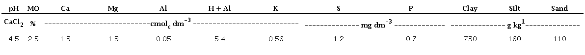 The region is characterized by a typical sub-humid tropical climate of the Cerrado [tropical wet and dry “Aw” (or Savanna climate), according to the Köppen classification]. The average annual rainfall is 1,200-1,400 mm and occurs between October and April, while the dry season, lasting from five to six months, coincides with the coolest months. The average annual temperature is 24.4 ºC. The soils in the area are classified as Latossolo Vermelho (Santos et al. 2013) and Oxisols (USA 2014) or Ferralsols (FAO 2014). The general soil chemical and physical properties are present in Table 1.