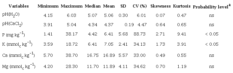 The variations of some of the soil properties analysed in this study are rather high (Table 2). The basic cations had CVs of 33-35 %, whereas the CV of P reached 89 %. However, a low CV was observed for soil pH (H2O and CaCl2), corroborating several studies that have reported that soil pH is among the most variable soil properties (Mulla & McBratney 2000, Vendrame et al. 2010, Vendrame et al. 2013).