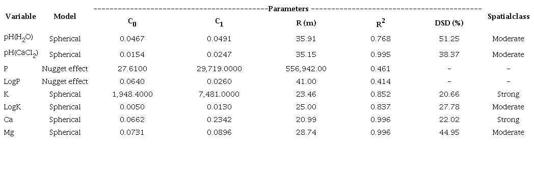 Table 3 shows the best fitted theoretical models and the estimated parameters of the experimental semi-variograms for the soil chemical properties. Of the models tested, the spherical model was the best for predicting the spatial variability, except for available P, which exhibited a nugget effect. The semi-variograms were calculated according to the spherical model for pH(H2O), pH(CaCl2), K, LogK, Ca and Mg. Phosphorus and LogP showed a nugget effect. Except for P and LogP, all the theoretical models gave a good fit to the experimental semi-variograms, and the values for the coefficients of determination (R2) were above 0.75 and, sometimes, close to 1 [pH(CaCl2), Ca and Mg]. The logarithm transformation did not improve the coefficients of determination of the models for K and P. The available P showed a nugget effect. Thus, it can be assumed that the distribution is completely random, with no spatial dependence between samples. This means that the methods of classical statistics may be applied with an arithmetic mean value that represents well the data set. However, it does not necessarily mean that there is a structure variance. The spatial dependence may occur at a shorter distance than the distance between the sampling points.