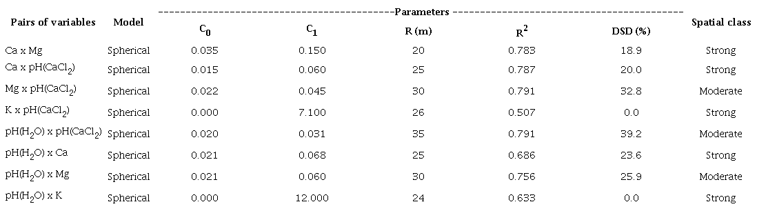 The cross semi-variogram estimates for pairs of variables using pH(H2O), pH(CaCl2), Ca, Mg and K are shown in Table 4. All the cross semi-variograms were fitted to the spherical model. All the pairs of variables showed a strong or moderate degree of spatial dependence. Their ranges are similar, varying from 20 to 35 m, with a mean of 27 m.