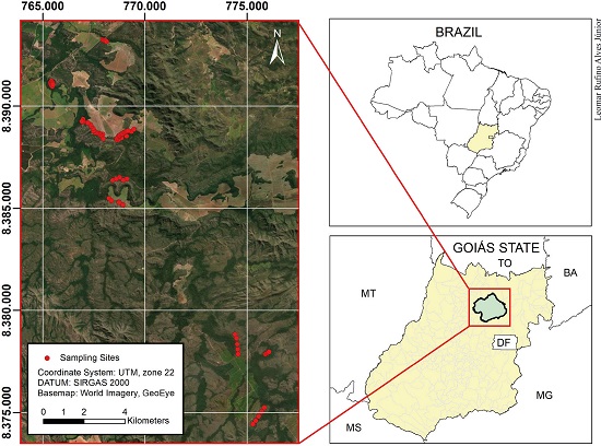 The study was carried out in four Cerrado phytophysiognomies (cerrado sensu stricto, cerradão, dry forest and ciliary forest) (Ribeiro & Walter 2008) within the Reserva de Desenvolvimento Sustentável Legado Verdes do Cerrado (Legado Verdes do Cerrado Sustainable Development Reserve - LVC), in Niquelândia, Goiás state, Brazil (14º29’55”S; 48º28’5”W) (Figure 1), between October 2017 and December 2020.