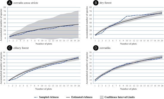 The sampling methodology proved to be sufficient for dry forest, ciliary forest and cerradão (Figures 2B, 2C and 2D). However, it represented only 50 % of the estimated richness for the cerrado sensu stricto (Figure 2A).