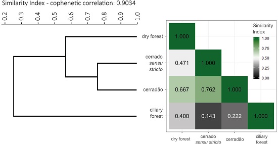 The floristic similarities between cerradão and cerrado sensu stricto and between these and the dry forest were high (Figure 3).