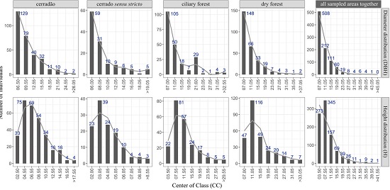 The mean values for DBH and height corroborated the expected gradient, with the smallest mean diameter for the cerrado sensu stricto (8.6 cm) and the largest (11.4 cm) for the ciliary forest (Table 1). The coefficient of variation for all phytophysiognomies being above 45 % (Table 1) reflects a variation in the data set related to the Cerrado heterogeneity. The distribution among height classes (Figure 4) revealed a unimodal pattern tending to a normal distribution, with individuals grouped mainly in the second and third classes, as seen in other studies (Maracahipes et al. 2011, Ferreira et al. 2015).
