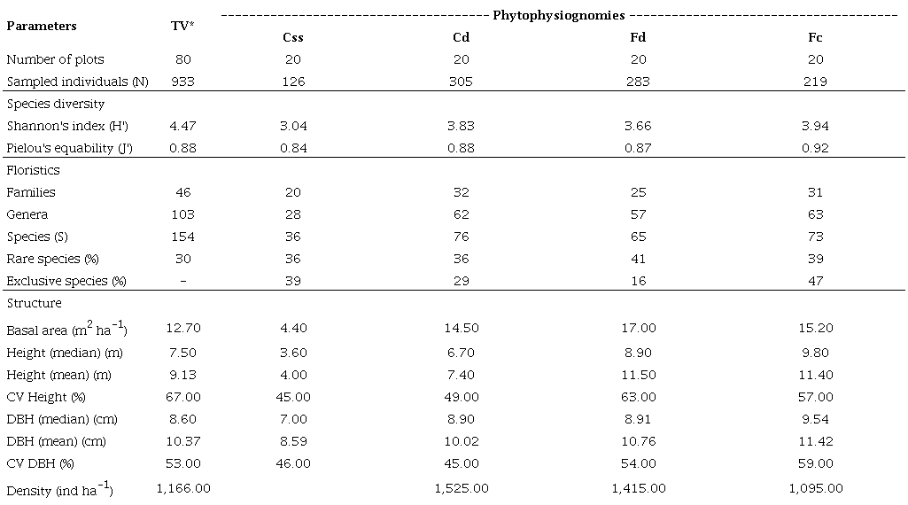Floristic and structural aspects of Brazilian Savanna phytophysiognomies in the northern Goiás state, Brazil