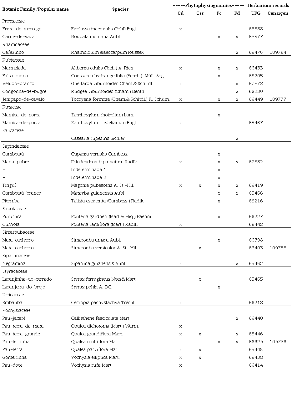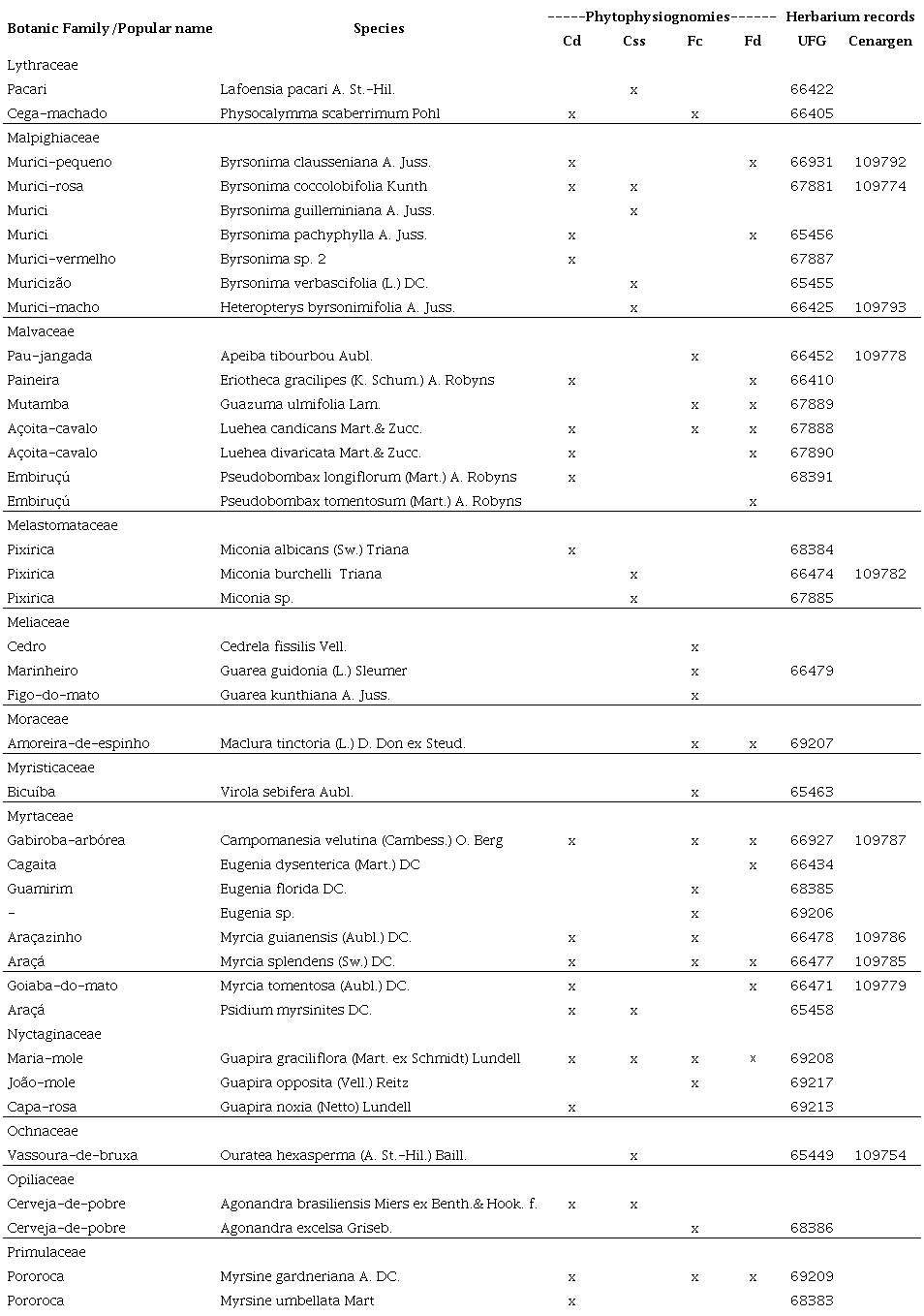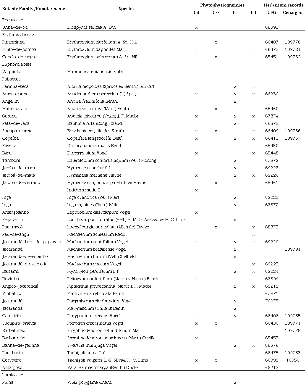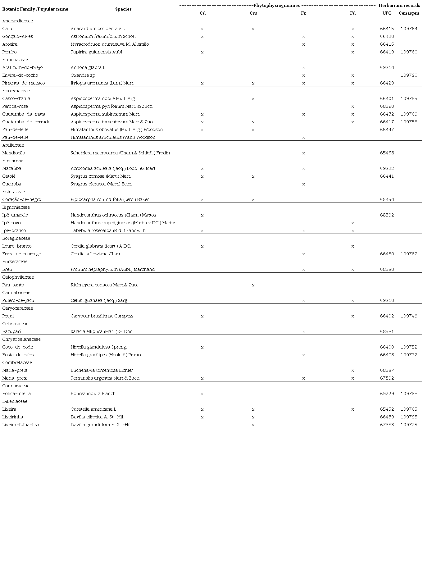 Fertile samples were collected and deposited in the herbariums of the Universidade Federal de Goiás (UFG) (Goiânia, Goiás state) and Cenargen-Embrapa (Brasília, Federal District), both in Brazil. The botanical families followed the classification system of the Angiosperm Phylogeny Group IV (Chase et al. 2016), while spelling, authorship and synonymy of scientific names were confirmed by consulting Flora do Brasil (Rio de Janeiro 2020). The choice of forest phytophysiognomies, plot size, inclusion criteria for arboreal individuals and botanical collection followed the National Forest Inventory standards (SFB 2015), in order to ultimately include the results in its database.