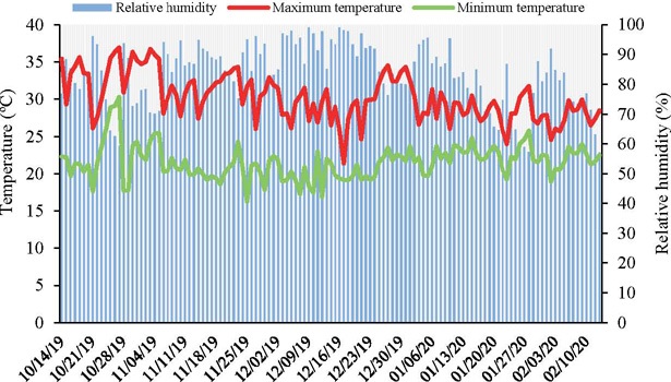 The study was carried out in a protected environment (23º25’S, 51º57’W and 542 m of altitude) of the Universidade Estadual de Maringá, in Maringá, Paraná state, Brazil. The cultivation was carried out from October 14, 2019, to February 13, 2020, being monitored the conditions of temperature and relative humidity of the ambient air (Figure 1), using a weather station installed in the protected environment.