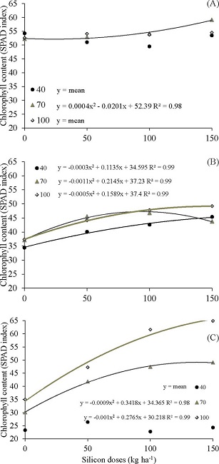Water availability affects the plant metabolism, whose dynamics directly correlate with chlorophyll and leaf temperature (Silva et al. 2015). According to Taiz et al. (2017), the reduction of photosynthesis occurs in response to conditions of more severe water deficit, when the availability of water is no longer sufficient to supply the metabolism of plants, resulting in less mass flow and absorption of nutrients (Barreto et al. 2017). In the phase I of the cauliflower development, the response of the SPAD index was not significant (p > 0.05) for the amount of Si applied in the water replacements of 40 % and 100 % of the ETc (Figure 2A).