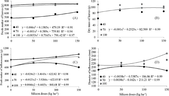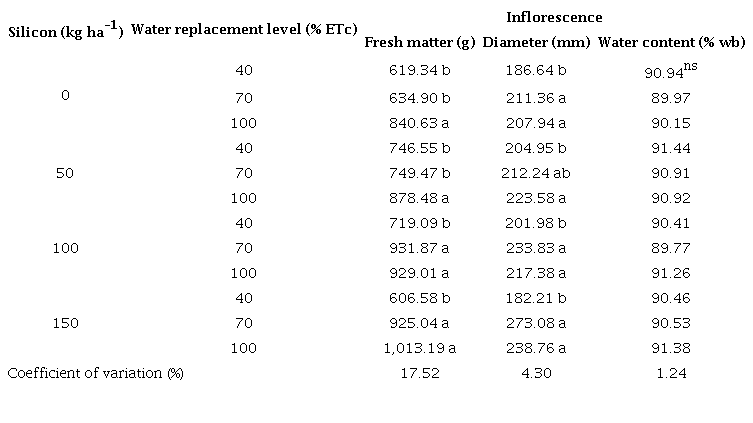 In conditions of water deficit, the absorption of nutrients is affected (Souza et al. 2019), especially during the development of the cauliflower inflorescence, when there is a greater nutritional demand (Alves et al. 2011). Combined with the development of other morphological components, production and translocation of metabolic and climatic conditions, there is an influence on the development and formation of the cauliflower inflorescence (May et al. 2007). There was a significant effect due to the water replacement levels and Si doses on the fresh matter and inflorescence diameter (Table 3).