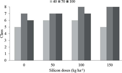 Coupled with yield (fresh matter), the inflorescence diameter may present a product appreciation character, when adopting product classification parameters. According to HortiBrasil (2011), larger diameters fit the upper classes, while visual defects may reduce the product category. In the conditions of 70 % and 100 % of the ETc, the use of Si increased the commercial quality for the doses of 100 and 150 kg ha-1, and, under the condition of 40 % of the ETc, with the application of 50 and 100 kg ha-1, the class was superior to the treatment without fertilization with Si and with fertilization of 150 kg ha-1; however, the classes were inferior to the other water replacement conditions (Figure 4).