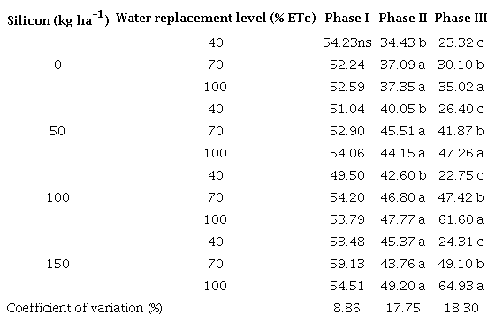 In the phase III, within each silicon dose, the increase in the water replacement implied an increase in the SPAD index (Table 1). According to Vieira et al. (2014), the increase in the level of water replacement up to 100 % of the ETc causes increases in the chlorophyll content; however, the excess of water reduces the oxygen in the root zone, promoting a decrease in the levels of chlorophyll in the leaves. The increase in water replacement also increases the chlorophyll fluorescence, reduces the leaf temperature and alters the carotenoid levels (Silva et al. 2015, Silva et al. 2020).