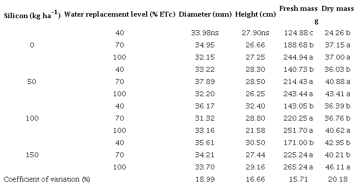 Regarding the water replacement levels, the stem fresh and dry matter in the condition of 40 % of the ETc were significantly lower in all Si doses, considering that there is a high deficit (60 %) that impacts the morphological development. For 70 % of the ETc, with Si application, there was no significant difference for fresh matter, concerning the condition without water deficit (100 % of the ETc), in the doses of 50, 100 and 150 kg ha-1 of Si, while, for dry matter with Si application greater than 50 kg ha-1, the results were lower (Table 2).