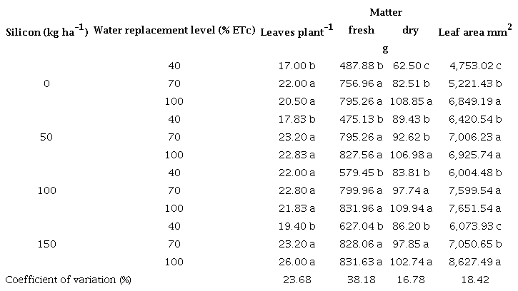 In the present study, the number of leaves, in the condition of 40 % of replacement of the ETc with doses of 0, 50 and 150 kg ha-1, was lower than for the other conditions (Table 3), diverging from the results obtained by Curvelo et al. (2019), using foliar application with the effect of Si associated with the form and time of application.