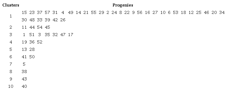 The Tocher cluster analysis allowed grouping the 57 progenies into ten divergent clusters. Cluster 1 was the largest group with 34 progenies, cluster 2 grouped four progenies, cluster 3 seven progenies, cluster 4 four progenies, clusters 5 and 6 two progenies each, and the other four clusters included only one progeny each (Table 1).