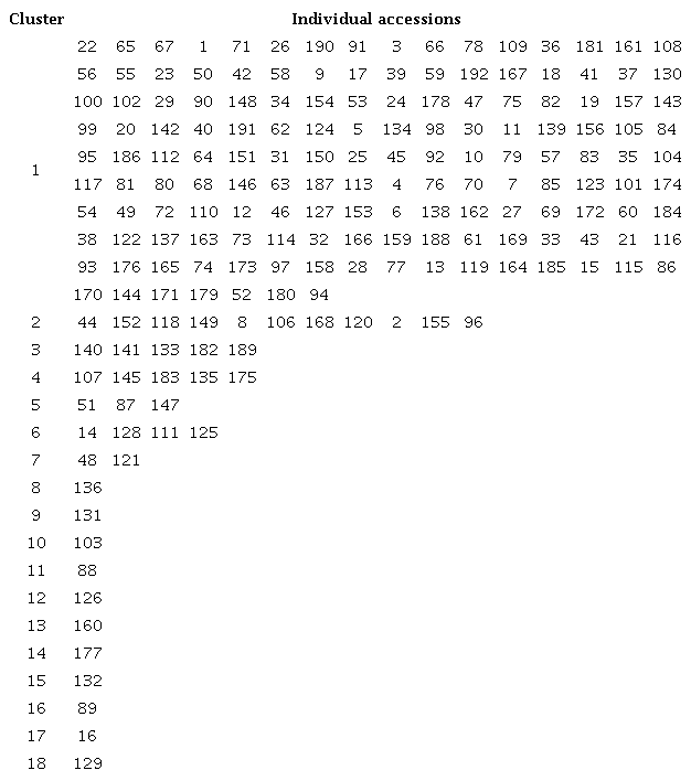 The formation of several clusters was observed in these subpopulations, what is a sign of structured genetic diversity. However, many clusters were formed by only one accession, demonstrating that the genetic diversity is poorly represented. In this situation, the loss of one genotype may influence the population variability. This observation led to the need to amplify the genetic base of the evaluated germplasm collection. In view of this, new expeditions to collect subpopulations that are poorly represented in the collection would be useful.