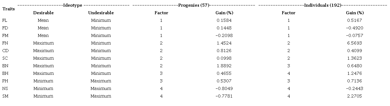 In the FAI-BLUP index, the number of ideotypes is defined based on the combination of desirable and undesirable factors for the selection objective. The number of ideotypes is given by the following equation: , where NI is the number of ideotypes and n the number of factors.
