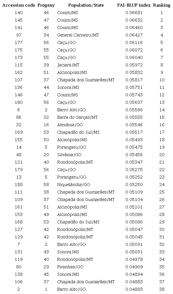 The FAI-BLUP selection index proposed by Rocha et al. (2018) is advantageous, because it can be used with unbalanced data, does not require weight assignment to the different traits and does not present a problem with multicollinearity. The index was satisfactory for the purpose of this study. In addition, the procedure allows the selection of genotypes by means of predicted genetic values, what excludes environmental effects.