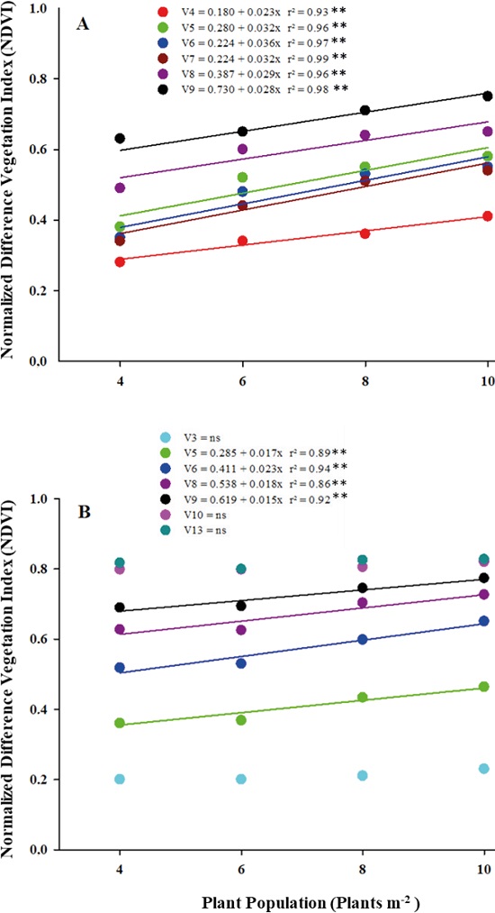 The identification of different corn plant densities was performed using the Greenseeker active optical sensor and the variations in the normalized difference vegetation index (NDVI) were related to the variation in plant population in both experiments (Figure 1). For all the phenological stages, the NDVI values increased linearly as the plant population increased. The coefficients of determination (R2) between these two variables were high, ranging from 0.93 to 0.99 for the growth stages evaluated in 2014 (Figure 1A) and from 0.86 to 0.94 in 2015/2016 (Figure 1B), thus confirming the relation between the increase in plant biomass and soil coverage by the canopy provided by the increase in plant population and the NDVI value.