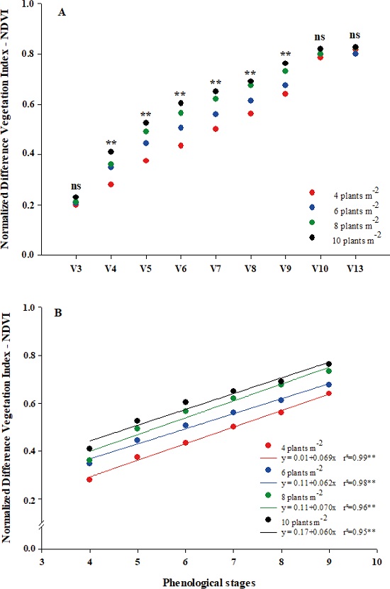 The plant populations were differentiated by NDVI readings between the phenological stages V4 and V9 (Figure 2A). In the phenological stages before V3 and after V9, the NDVI measured by the Greenseeker sensor reduced its sensitivity, resulting in difficulties in differentiating plant populations, since, in the early growth stages, there is little ground cover by plants, resulting in a low amount of biomass in the sensor reading area. In phenological stages after V9, due to the high accumulation of shoot biomass and maximum coverage of the soil surface by the canopy, there is a saturation of this vegetation index. From the V9 stage onwards, a high amount of biomass occurs at all plant densities (high leaf area index) and the inter-row spaces are almost or completely covered by the canopy, resulting in the saturation of NDVI values (Santos et al. 2014, Vian et al. 2018b).