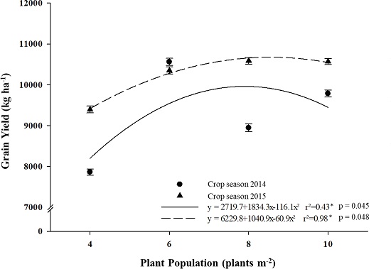 The grain yield was also affected by plant population (Figure 3). In 2014, there was an increase in grain yield up to the population of 7.7 plants m-2, with a maximum yield of 10,616 kg ha-1. In 2015/2016, on the other hand, the increase in grain yield occurred up to the density of 8.7 plants m-2, with a maximum yield of 10,680 kg ha-1 (Figure 3). This higher grain yield obtained with a lower plant population in the second year is associated with the fact that there was a water deficit period of approximately 15 days, coinciding with the flowering and grain filling stages. Therefore, when using larger plant populations in an environment without irrigation, the grain yield decreases, if compared to lower plant densities, due to the increased competition between plants for water, nutrients and solar radiation throughout the cycle (Sangoi et al. 2010), even with sowing at the recommended time for this region.