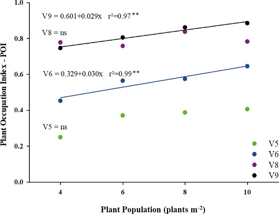 The variation in plant population was reflected in variations on the NDVI values, as well as on POI (Figure 4). At lower plant populations, there are more “empty’’ spaces, when compared to higher ones. Thus, there is a tendency that a maximum soil coverage occurs from the stages V9 to V10, reaching approximately 0.9 of POI, that is, close to a maximum vegetative development and almost maximum soil coverage by the canopy. The plant populations (4-10 plants m-2) presented an increase in soil coverage, within each evaluated phenological stage, of 15 % in V5, 19 % in V6 and 17 % in V9, that is, reduction of “empty’’ spaces with increasing plant developmental stage (Figure 4).