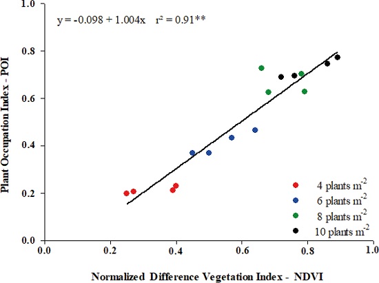 One of the most used vegetation indexes is the normalized difference vegetation index (NDVI), which can be used to identify the spatial variability of plant vigor and the canopy biomass through red and near-infrared reflectance of plants. Moreover, another alternative way of evaluating the plant canopy biomass is the plant occupation index (POI), which indicates the proportion occupied by green plant parts in a digital image that detects the reflectance of the visible spectrum (blue, green and red) and can be correlated with leaf area index, NDVI and canopy biomass.