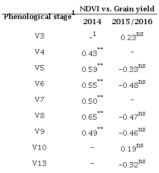 The grain yield was significantly correlated with the NDVI values assessed by the Greenseeker sensor (Table 1) only in 2014. In 2015/2016, on the other hand, there was no significant correlation between these variables. This may be explained by the vigorous vegetative growth at the initial development in all plant populations, as can be seen by the NDVI values, which were influenced by the large rainfall volumes (an El Niño year). At the flowering stage, however, there was a reduction in the grain yield potential, especially at the higher plant populations, due to the water deficit that occurred between the flowering and grain filling stages.