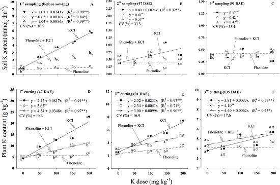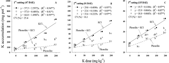 There was a linear accumulation of K in the shoots as a function of increased doses of the nutrient at all the cuttings. However, plants fertilized with KCl absorbed and accumulated more K than those treated with phonolite at all the cuttings, while the fertilizer blend resulted in intermediate K accumulation values (Figures 2A,2B and 2C).