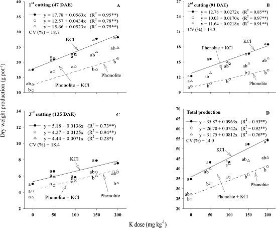 The K application also increased the dry weight production at all the three cuttings, with differences observed among the sources (Figures 3A,3B and 3C). At the first two cuttings, particularly at higher K doses (150 and 200 mg kg-1), KCl produced better yields than those obtained with phonolite, whereas the fertilizer blend resulted in intermediate yields (Figures 3A and 3B). The same dynamic was observed for total yield over the study period (Figure 3D).