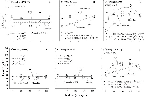 On the other hand, the number of leaves was only influenced by K doses at the third cutting, and no differences were observed among the sources (Figures 4D,4E and 4F). Under a quadratic effect, 118 and 121 mg kg-1 of K produced the highest number of leaves (160 and 159 pot-1) for the KCl and fertilizer blend, respectively. This variable increased linearly when phonolite was applied, with the highest K dose (200 mg kg-1) resulting in 145 leaves pot-1. The fact that the number of leaves and tillering were affected by the treatments, particularly in the third cutting, may be related to the height at which the plants were cut (at the ground level), which could increase the plant dependence on nutrients in the soil over time.