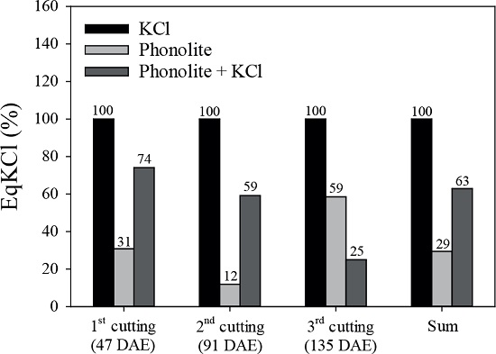 Agronomic efficiency was assessed using the method proposed by Goedert et al. (1986), with KCl as a reference source (EqKCl), calculated as the ratio between the K doses (in the form of KCl and the test source) that provided the same yield, converted into percentage: EqKCl(%) = (X1/X2) x 100, where X1 is the KCl-based K dose needed to achieve the maximum yield obtained with the test source and X2 the K dose needed from the test source to achieve maximum yield. It was determined considering a dose of 200 mg kg-1 of K for phonolite alone and the fertilizer blend.