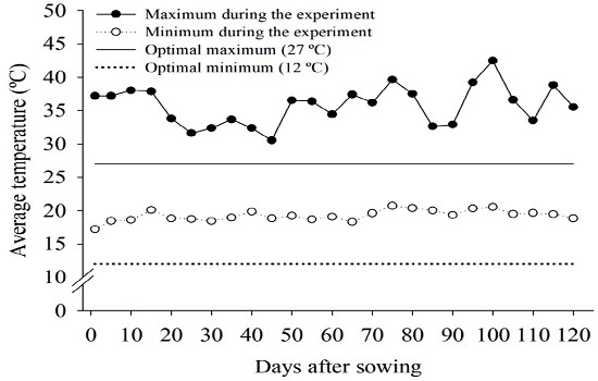 The experiment was conducted between October 28, 2019, and February 25, 2020, in a greenhouse (20º45’36.0”S, 42º51’47.4”W and 685 m of altitude), under natural photoperiod. The maximum and minimum temperature values (Figure 1) were daily recorded with a digital thermo-hygrometer (J. Prolab™) installed inside the greenhouse (1.80 m above the ground level). The average air relative humidity was 62.75 %, with minimum of 37.53 % (1.06 %) and maximum of 87.98 % (10.94 %).